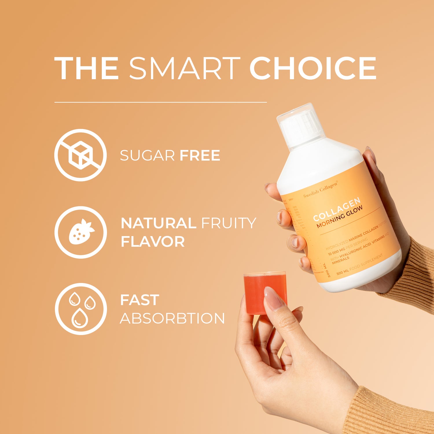 Start din dag med et strålende boost fra SWEDISH COLLAGEN morgenglød, en kraftfuld blanding af 10.000 mg hydrolyseret marint kollagen og biotin der understøtter hud, hår, og negleForbedret med C-vitamin, A-vitamin, B-kompleksvitaminer, selen, og silica, denne avancerede formel nærer din skønhed indefra. Med de ekstra fordele ved hyaluronsyre, MSM, DMAE, og mikroindkapslede probiotika, det fremmer også hydrering, cellulær fornyelse og tarmbalance. Bare 25 ml om dagen hjælper dig med at stråle naturligt – både indvendigt og udvendigt.